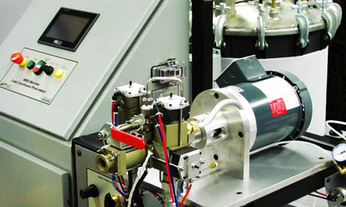 Metering pump sizes are selected to match your ratio and output requirements. Accurate ratio settings are made by presetting the ratio at the touchscreen interface. When the footswitch is depressed, the servomotors digitally drive the pumps, displacing on-ratio streams of A and B component materials to the static (motionless) or dynamic (motor-driven) mixer. (Outputs up to 30 lbs/min.) (Ratios: 1:1 to 1:100)